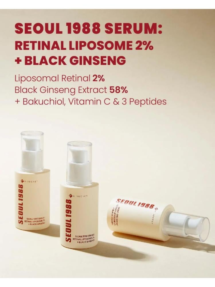 استعيدي شباب بشرتك مع K-Secret Seoul 1988 Retinol 2% + Black Ginseng Serum، تركيبة كورية متطورة تمزج بين قوة الريتينول لمكافحة علامات التقدم بالسن، وخصائص الجينسنغ الأسود المغذية لتجديد البشرة ومنحها إشراقة طبيعية.